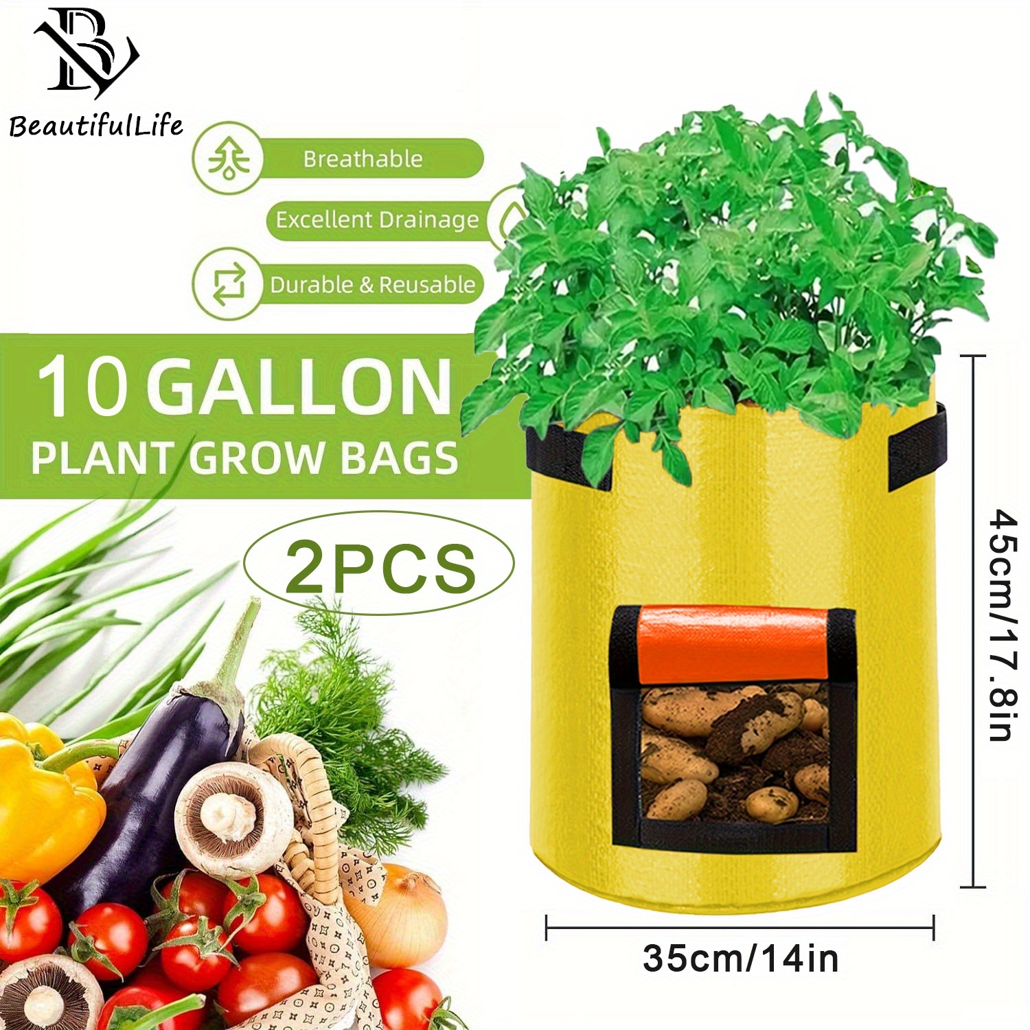 TEMU 2개 식물 재배 백, 1/3/5/7/10 갤런 PE 감자 재배 백 (손잡이 포함), 정원 채소 & 토마토용, 노란색