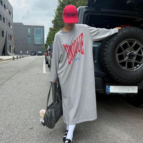 [신상오픈런]여자 레터링 양트임 롱슬리브 박시 일자핏 롱원피스