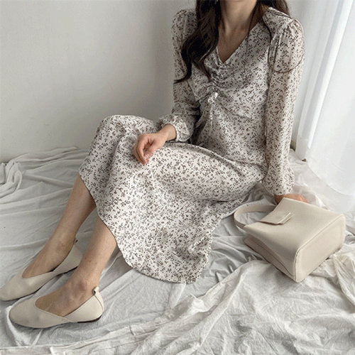 더클립 / 클러버 셔링 플라워 롱 원피스 - 2color