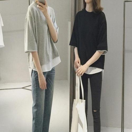 [엄지척]여성 레이어드 스타일 루즈핏 반팔 무지 롱 티셔츠_19555267_667501