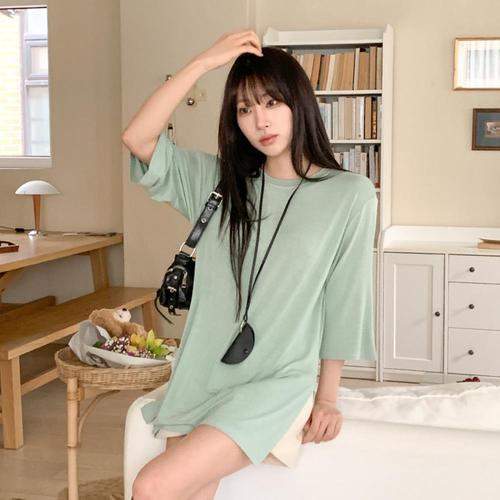 [옷자락]여자 루즈핏 옆트임 롱 반팔 데일리 티셔츠