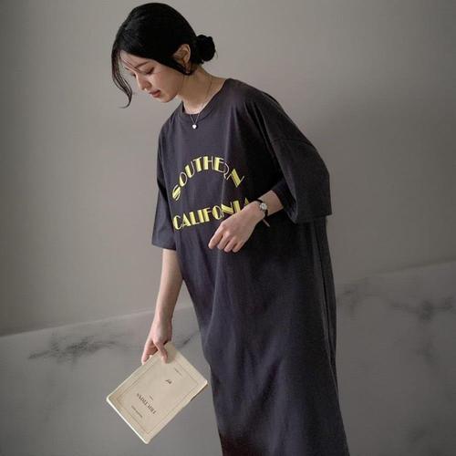 [옷자락]여성 일상 레터링 루즈핏 면 반팔 롱 드레스