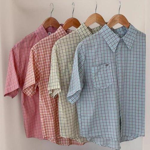 [리빌모아]여자 오버핏 사각체크 포켓 카라 반팔 셔츠 SDW-BLH-SLL1001419