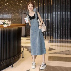 여성용 데일리 청원피스 루즈핏 민소매 미디 데님 멜빵 원피스
