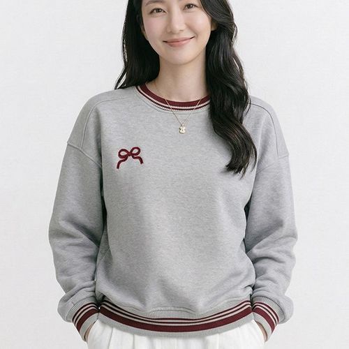 NT3256 여성 리본 자수 포인트 라운드넥 긴팔 맨투맨 티셔츠