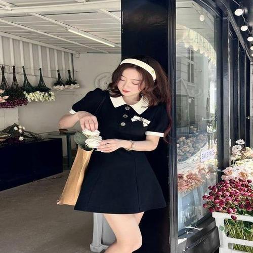 [셀러허브_여성트랜드패션]ONM 리본브로치 카라 배색 반팔 블랙 플레어미니원피스