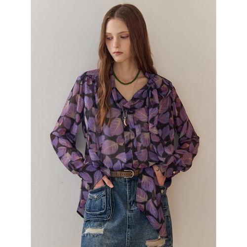 [마쟈]리프 패턴 리본 타이 쉬폰 블라우스