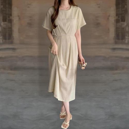 |CHO5639|여성용 린넨 스퀘어넥 반팔 롱 원피스 핀턱 디자인
