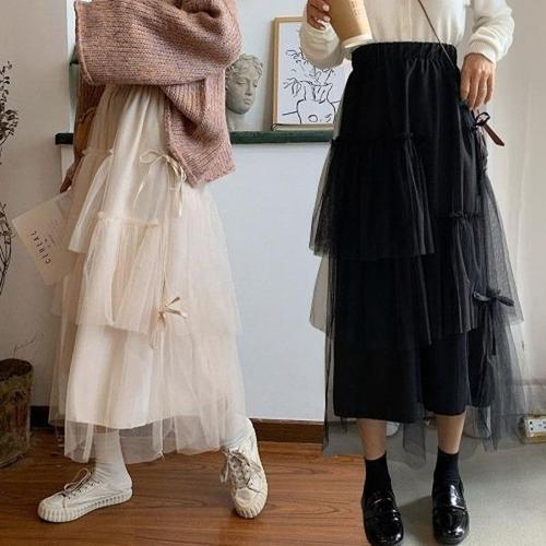 [XBJ6209L]여성 옆 리본 끈 롱 기장 망사 3단 레이스 치마