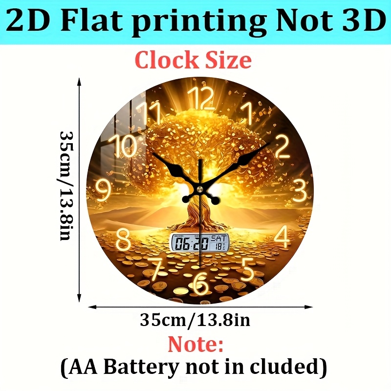 TEMU 1개 골든 머니 트리 벽시계 - 돈 디스플레이 & 날짜 표시, 무소음 스위스 쿼츠 , 인조 나무/플라스틱 원형 시계, 사무실 장식용 - 14/16인치 (AA 배터리 미포함) 크리스마스 장식, 2D 평면