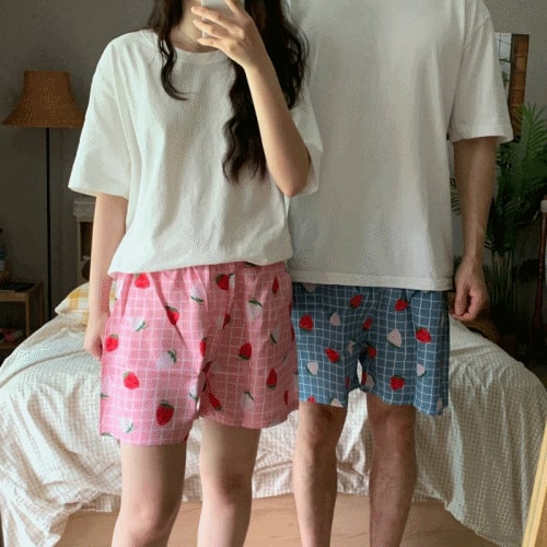 커플 체크 딸기 인견 아이스 냉장고 잠옷 반바지 2color