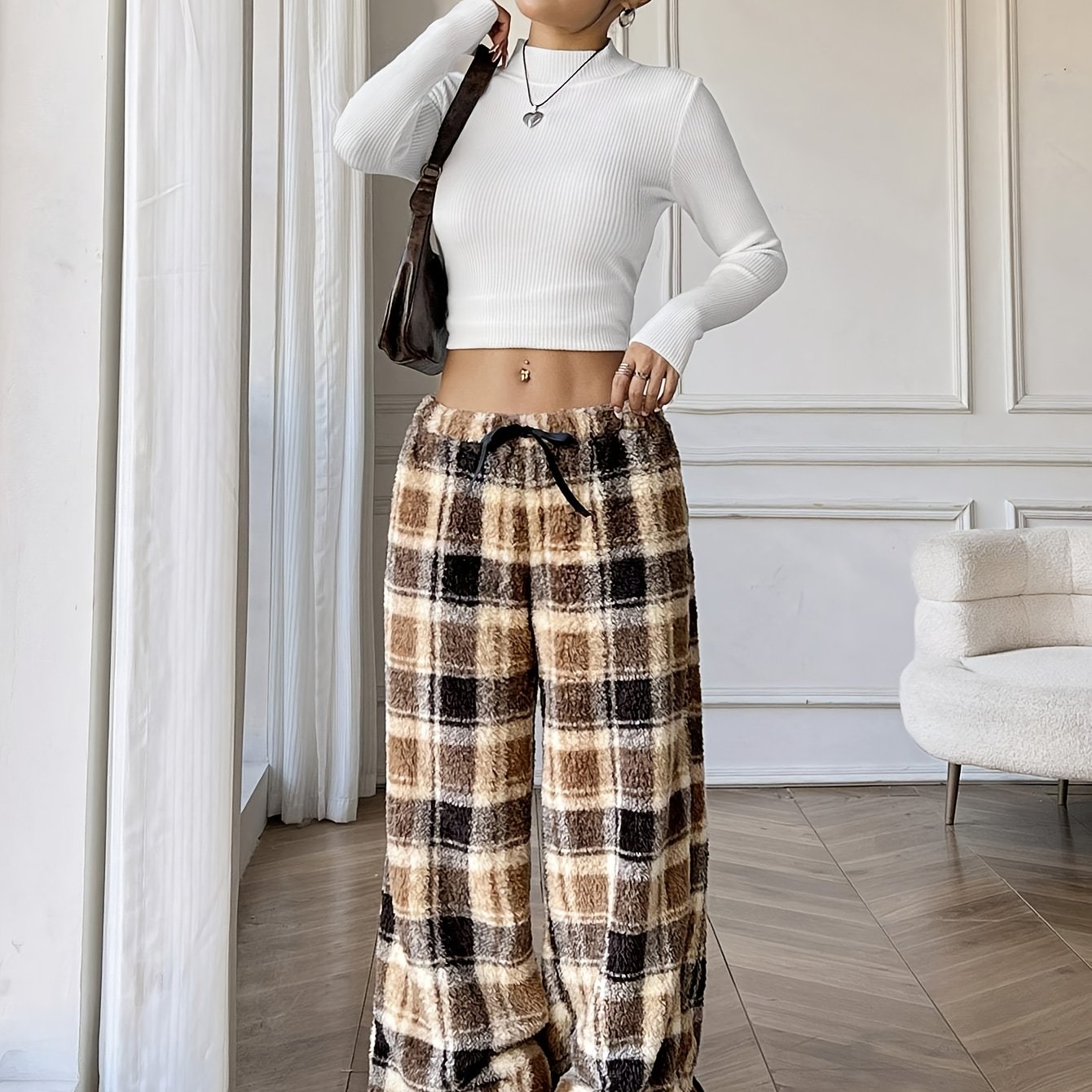 TEMU 체크 무늬 플러시 와이드 레그 팬츠 - 여성용 편안한 홈웨어, 부드럽고 스타일리시함, 루즈핏, 야외 활동에 적합, 따뜻함, 가을, 겨울 필수템.
