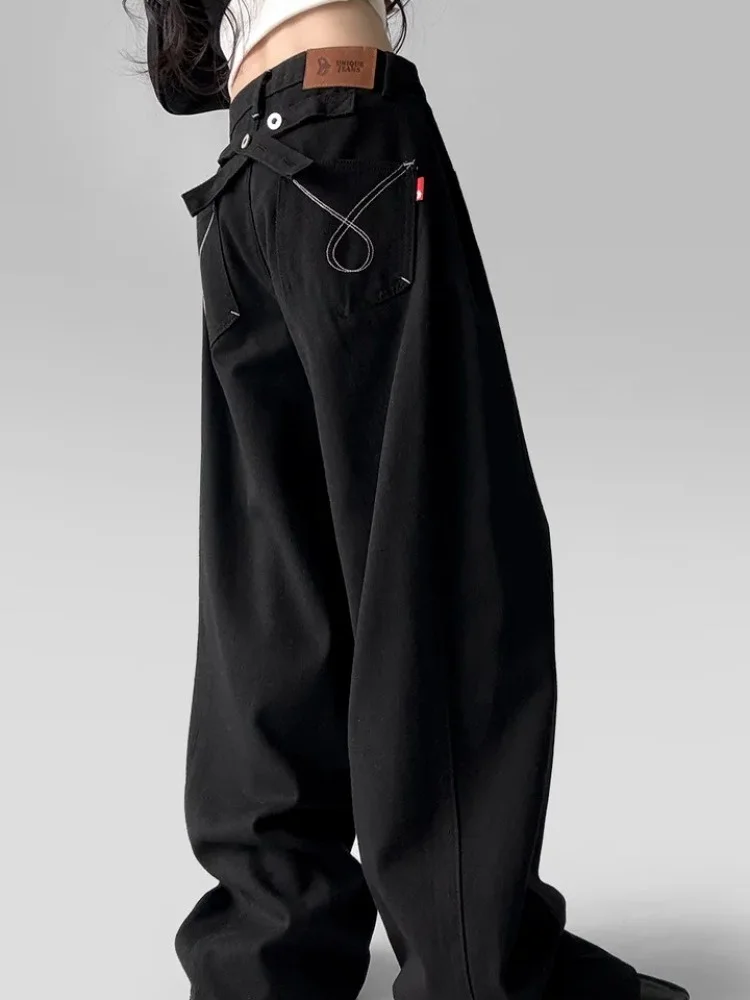한국어 빈티지 하이 웨스트 여성 청바지 Y2K 슬리밍 배 모양의 느슨한 스트레이트 벨 바닥 블랙 그레이 헐렁한 데님 바지