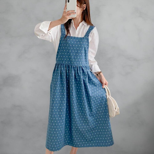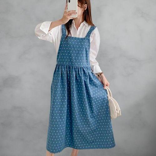 [옷자락]여성 청멜빵 백리스 도트 대형 사이즈 밴딩 면 롱드레스