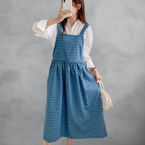 [옷자락] 여성 청멜빵 백리스 도트 대형 사이즈 밴딩 면 롱드레스