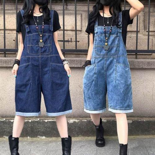 치유쿠 여자 여름 와이드 멜빵 연청 반바지