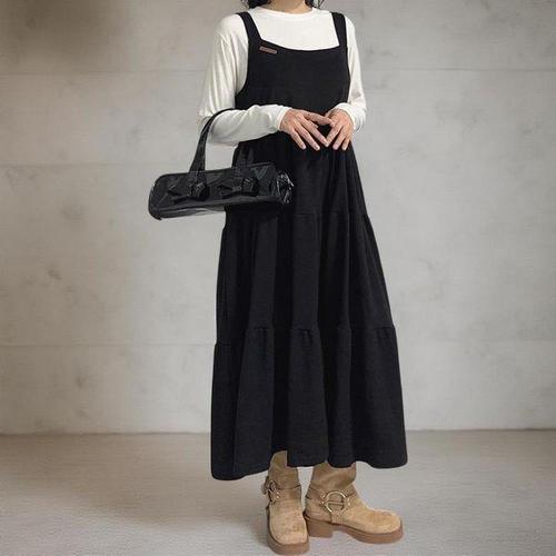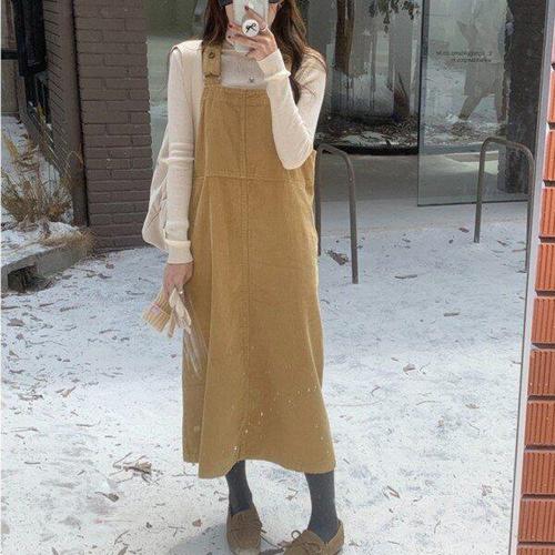 [옷자락] 여성 사랑스러운 가을 멜빵 빅사이즈 라벨 롱드레스