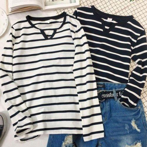 [모노무드]LMO 가로줄 우먼 상의 브이칼라 여성장팔 탑 데일리
