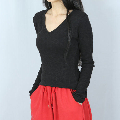 [파라노말샵](허리잘록) 4색 골지 모달 딥 브이넥 긴팔 티셔츠 (파