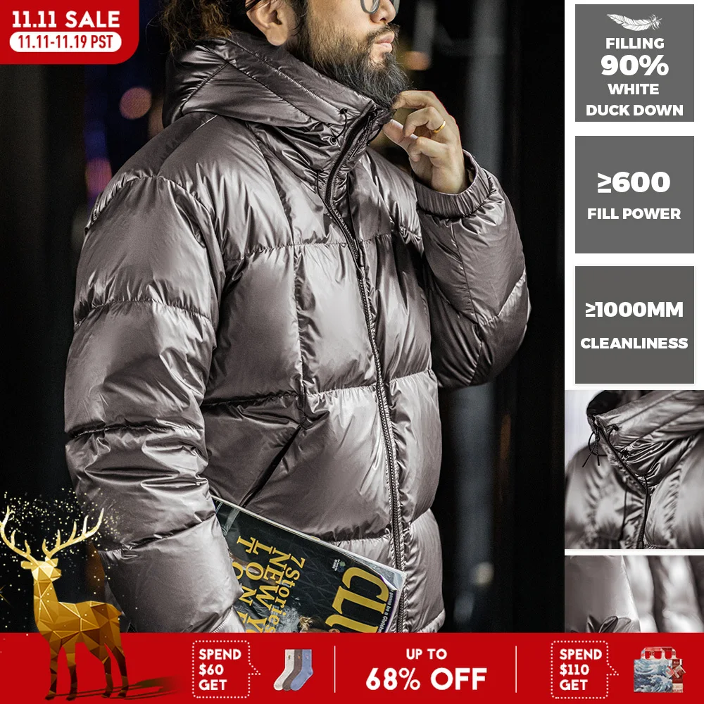 Maden 남성용 캐주얼 광택 후드 90% 화이트 덕 다운 재킷, 따뜻한 스탠드업 칼라 퍼퍼, 다목적 단색 코트, 겨울
