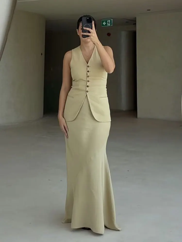 2024 여성 조끼 세트 카키색 V넥 민소매 포켓 조끼 탑 + 엘라스틱 하이웨이스트 비대칭 슬림 여성 롱 스커트