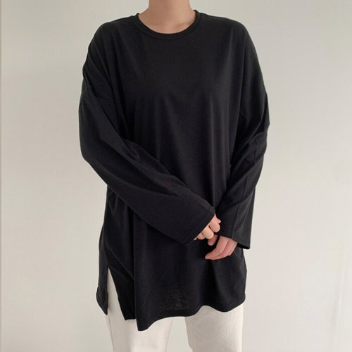 [유야]여성 면 무지 라운드 긴팔 트임 롱 티셔츠 -FTS0376- 봄 가을