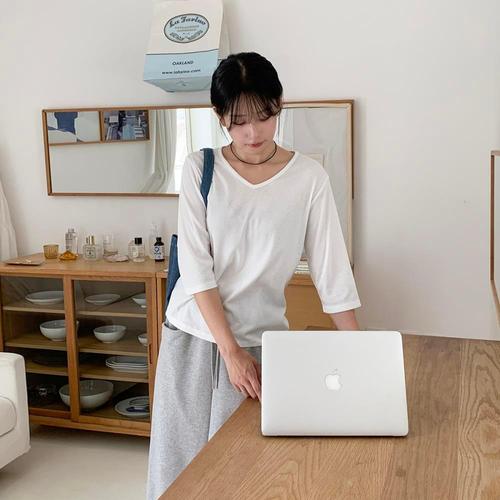 [옷자락] 여성 무지 컬러 스판 8부 브이넥 골지 티셔츠