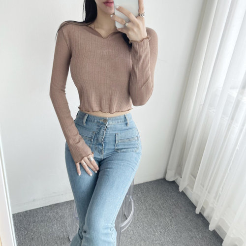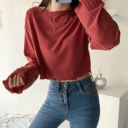 글램핏 / 물결 밑단 슬림핏 러블리 세미 크롭 긴팔 티셔츠 4컬