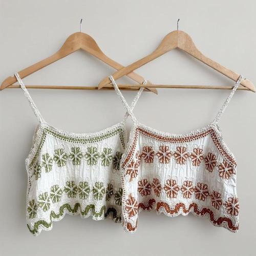 [미라클세븐]여성 여름 물결 패턴 크롭 뜨개 니트 플라워 배색 바캉스 나시