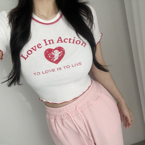 글램핏 / 러블리 하트 프린팅 물결 프릴 골지 슬림핏 반팔 크롭 티셔츠 3컬러