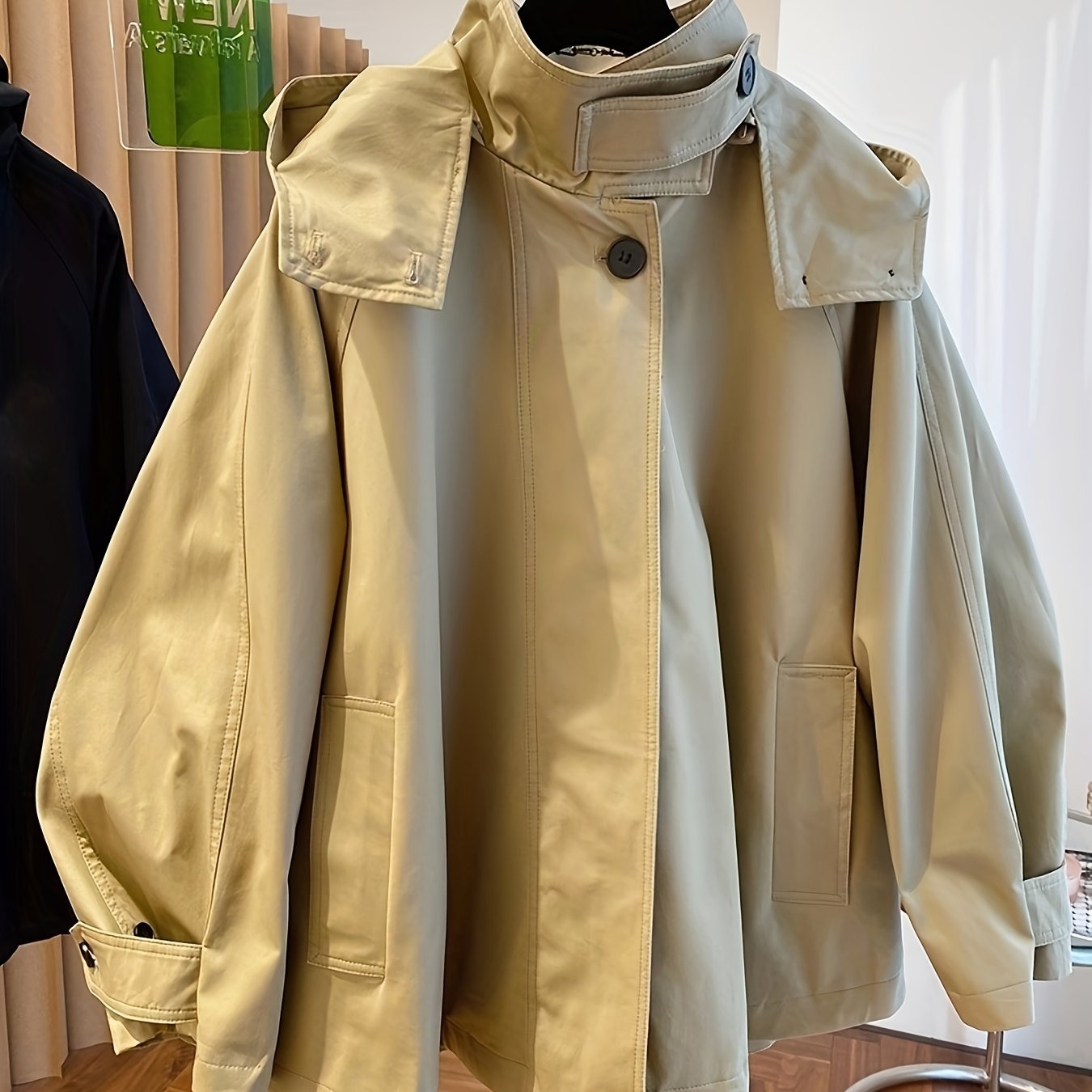 TEMU 여성 베이지 트렌치 코트 - 캐주얼 루즈핏 후드 , 버튼 디테일, 긴 소매, 단색, 봄 & 가을에 완벽한 캐주얼 아우터웨어 | 버튼 후드 코트 | 부드러운 질감