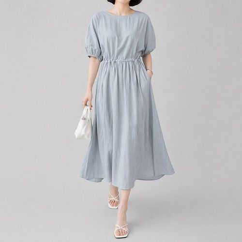 미즈큐즈 / 라운드넥 허리 스트링 셔링 반팔 롱원피스