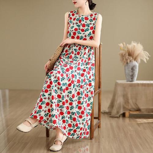 2591802 - 플라워 민소매 롱원피스 루즈핏 빅사이즈 여름원피스 린넨원피스 면원피스 40대 50대 100사이...