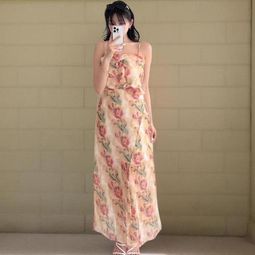 [모노무드]모노무드 여성 플라워 쉬폰 끈나시 롱원피스 1P 여름 바캉스