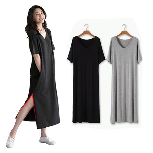 [오너클랜]인기상품 여성 2색 민무늬 신축성 밑단절개 브이넥 롱 원피스 [W9B0E3C_260409]