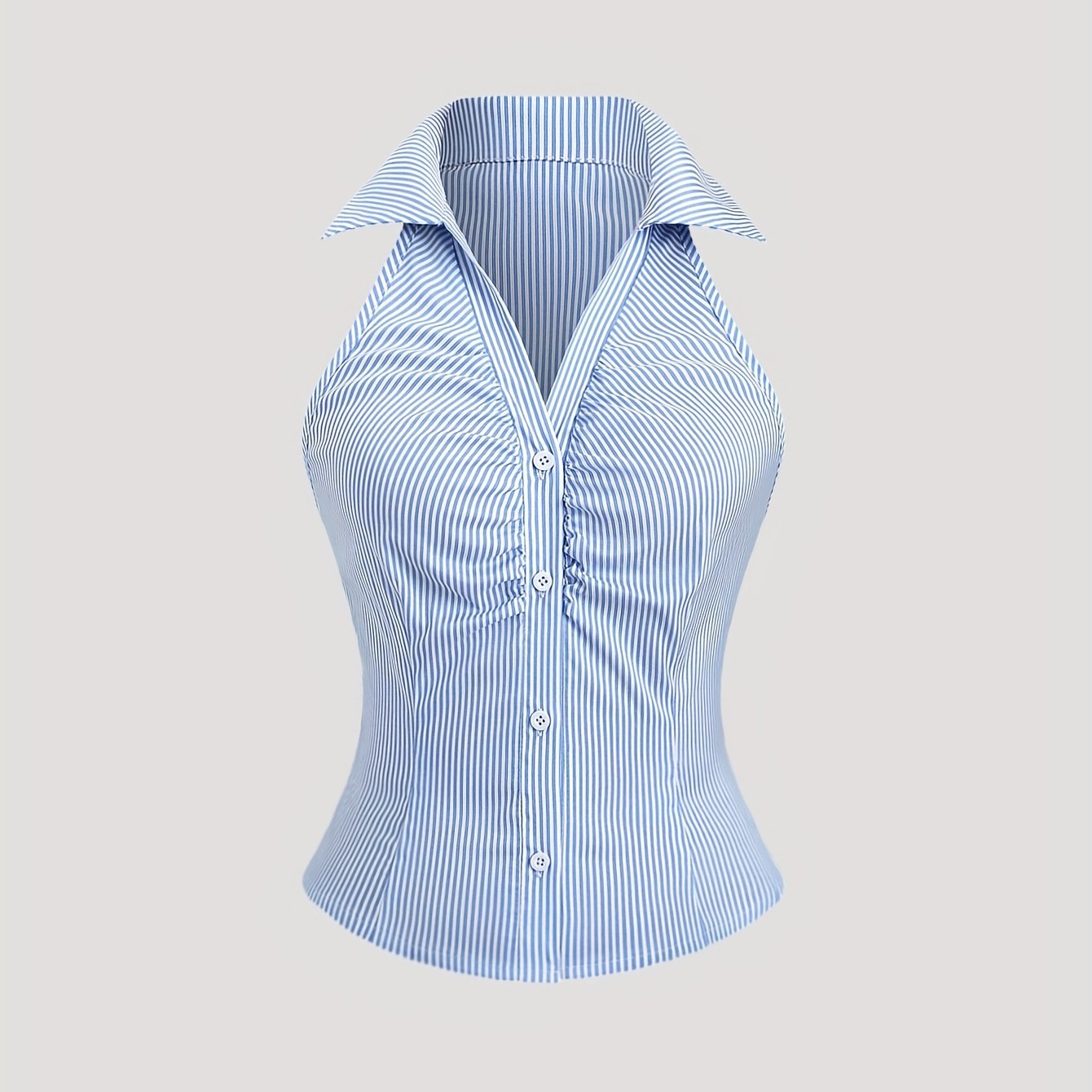 TEMU 여성용 블루 민소매 블라우스 - 오픈 칼라 버튼 프론트 슬림핏 캐주얼 우아한 셔츠 봄 & 여름용, 세탁기 사용 가능, 여름 패션 탑 | 디자인 | 매끄러운 질감 원단