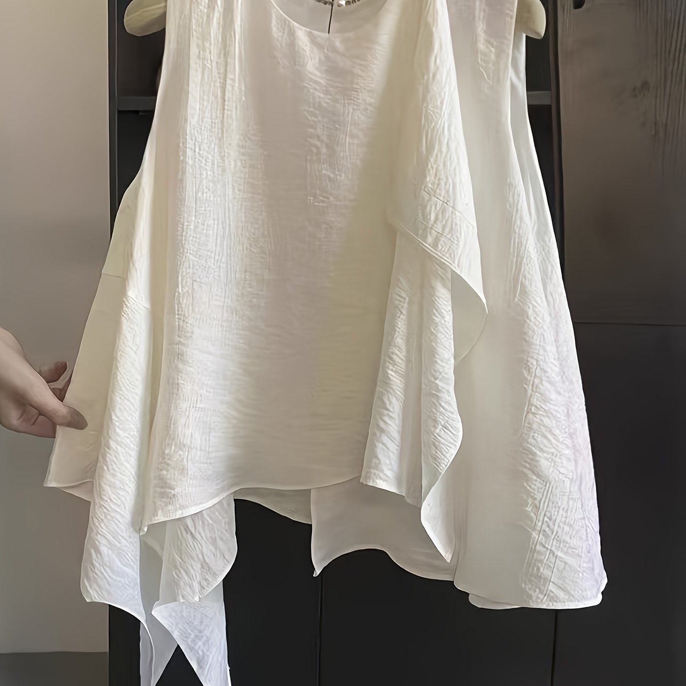 TEMU 여성용 여름 민소매 셔츠 - 가볍고 캐주얼한 화이트 블라우스, 비대칭 밑단 & 라운드넥, 기계 세탁 가능 솔리드 컬러 탑, 다재다능한 스타일링, 일상 편안함, 우아한 심플함, 부드러운 소재