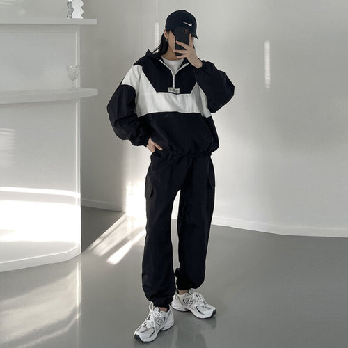 [럽즈올] 여성용 빅사이즈 오버핏 아노락 후드 반집업 와이드팬츠 조거바지 트레이닝 세트