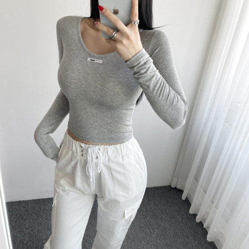 글램핏 / 크롭 유넥 바스트 패치 슬림핏 운동복 긴팔 티셔츠 3