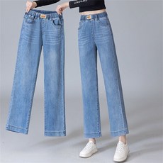 TKX 여성용 고무줄 허리 밴드 워싱 스트레이트핏 데님 팬츠 청바지 캐주얼 간편한 데일리룩 K76