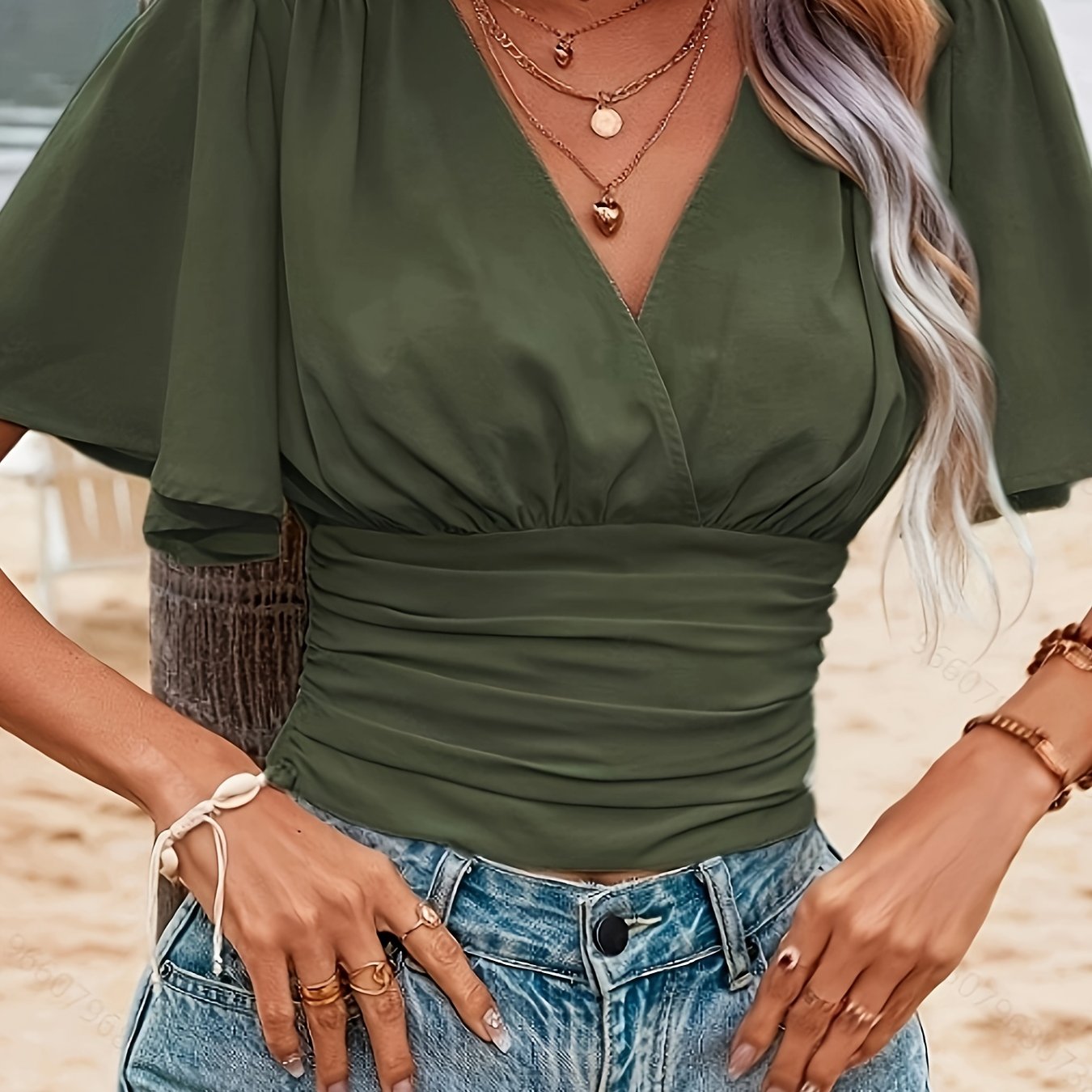 TEMU 여성용 프렌치 스타일 V넥 크로스 프론트 웨이스트 디자인 플러터 소매 숏 블라우스