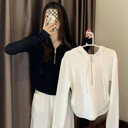 [굿쇼핑몰_의류]여성 캐주얼 무드 루즈핏 반집업 후드 긴팔 티셔츠