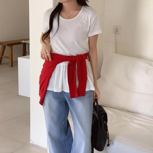 여자 반소매 잔주름 U넥 내의 캉캉프릴 티셔츠