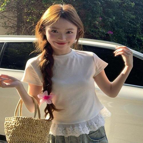 [모노무드]모노무드 여름 프릴 레이스 반팔티셔츠 슬림핏 블라우스 여성용 페미닌 스타일