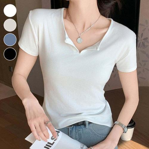 [신상오픈런]여성용 슬림핏 골지 반팔티셔츠 스판 소재 단추 포켓 데일리 착용