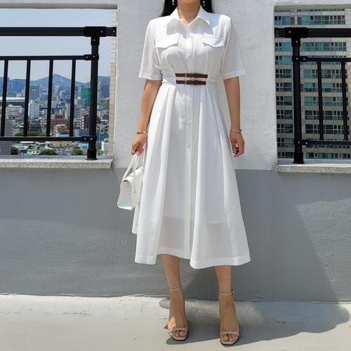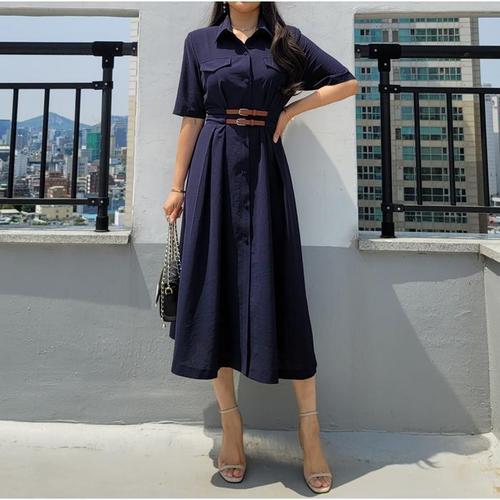 [바이어스]벨트 셔링 카라 싱글 A라인 반팔 롱 셔츠 원피스 코디 (15240514A)