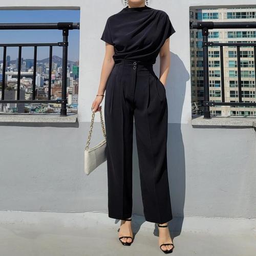 [바이어스]셔링 주름 드레이프 반 폴라 블라우스 슬랙스 세트 룩 (14672056A)