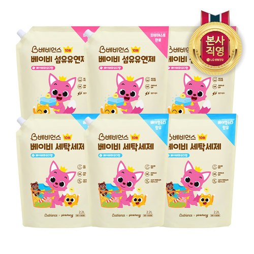베비언스 핑크퐁 유아세제 리필 2.2L 3개+유연제 리필 2.2L 3개