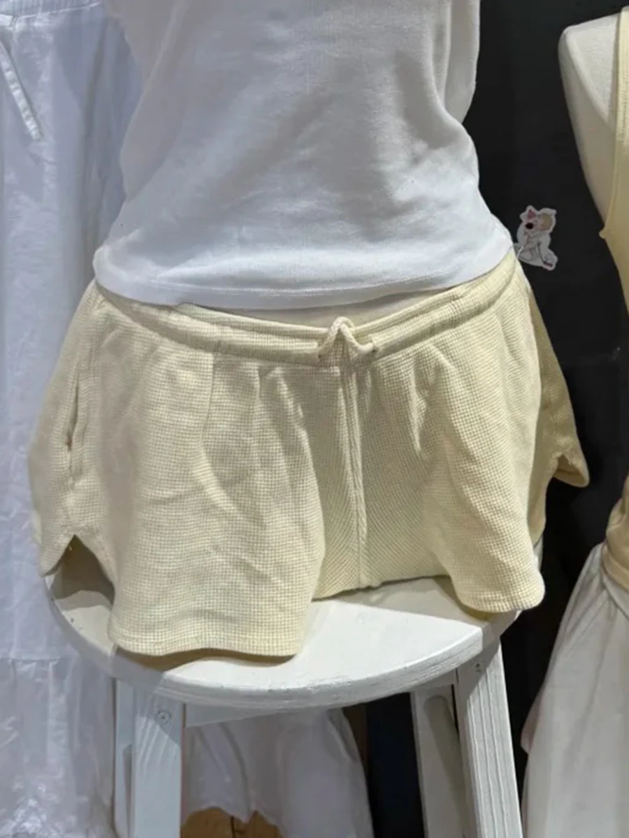 새로운 노란색 와플 캐주얼 스웨트 반바지 여성 여름 코튼 하이 웨이스트 여름 반바지 캐주얼 솔리드 스위트 드로우 스트링 스포츠 반바지