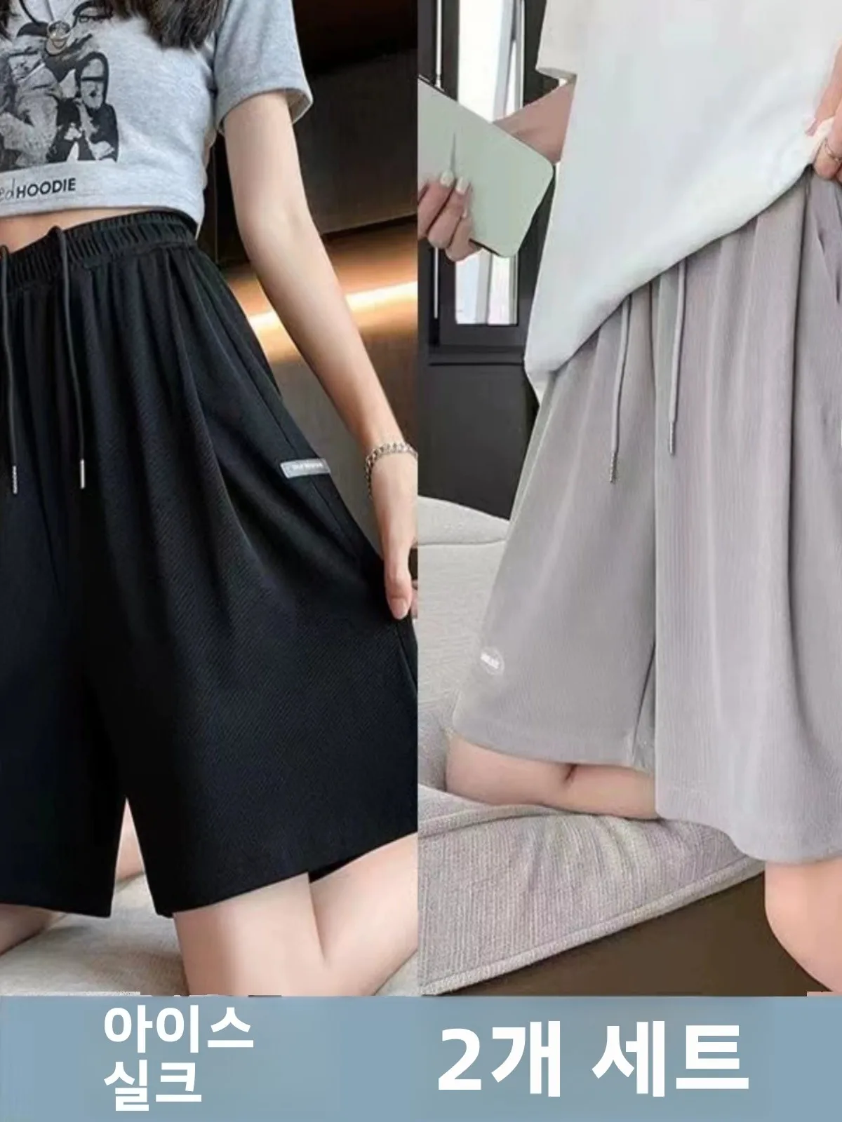 2피스 아이스 실크 스포츠 반바지 여성용 하이웨이스트 루즈 캐주얼 와이드 레그 팬츠 5부 길이 출퇴근 스타일 한국 패션